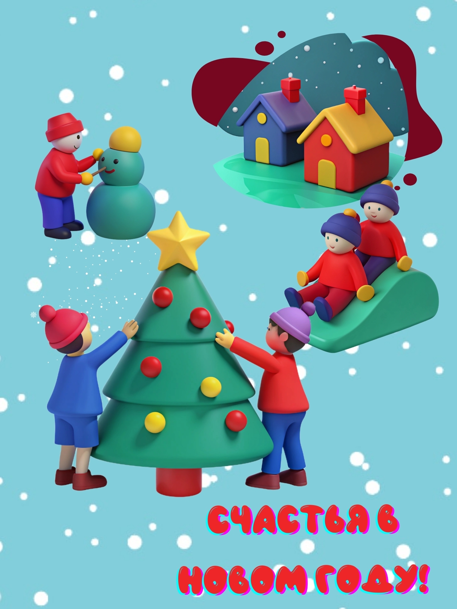 Открытка из сюжетов новогоднего детского праздника, дети наряжают елку, папа и мальчик лепит снеговика,дети катаются на санках с горки,нарядные домики,снегопад