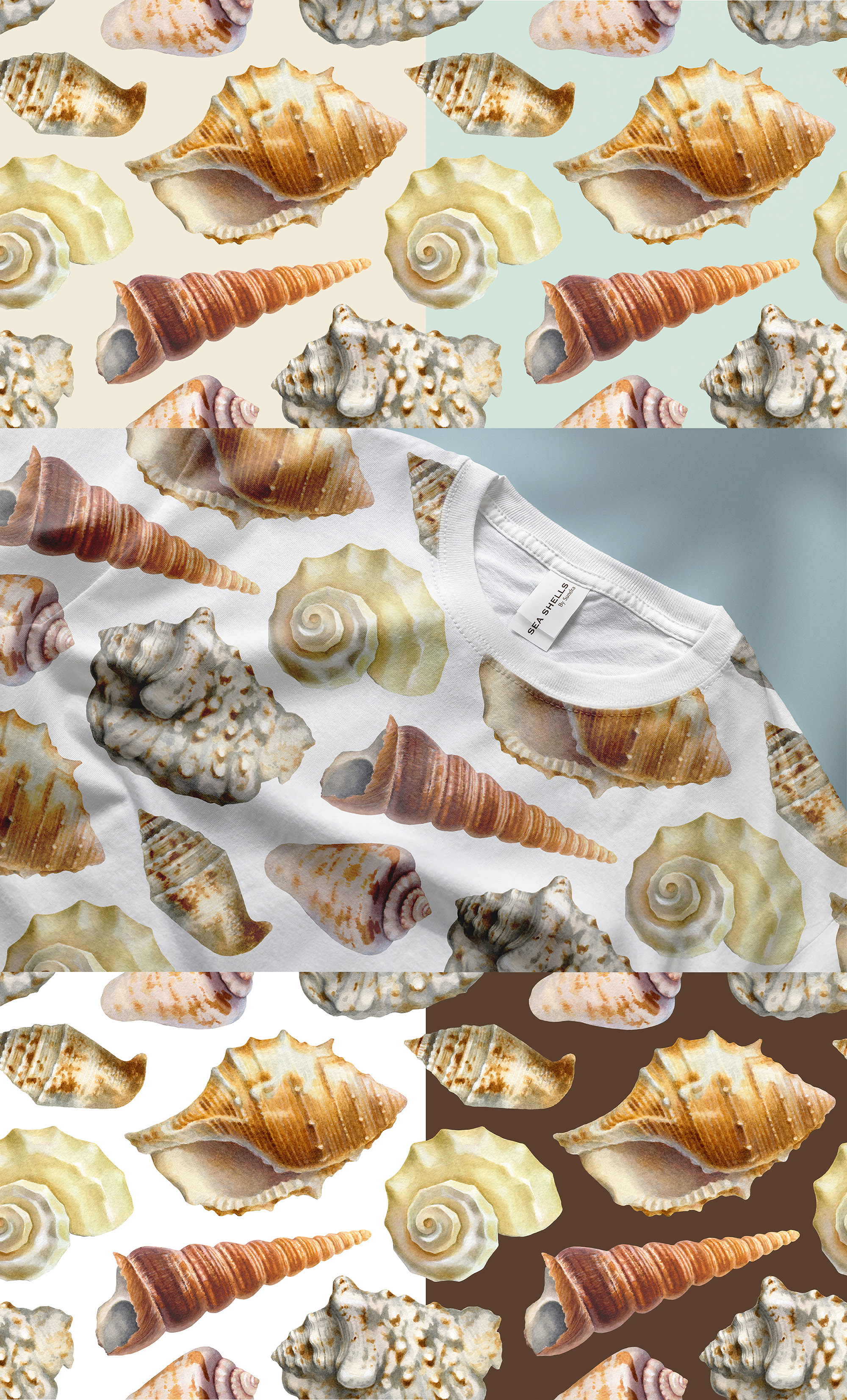 Бесшовный паттерн с живыми, детализированными рисунками морских ракушек, нарисованными акварелью с натуры. Идеально подходит для принтов на текстиле, упаковке, полиграфии и скрапбукинге. После покупки вы получаете один дизайн в четырёх расцветках в формате JPEG, размером 5000Х5000 px, 300 dpi, на коричневом, бежевом, голубом и белом фоне, а так же один файл PNG, размером 5000Х5000 px, 300 dpi с прозрачным фоном. Разрешено коммерческое использование паттерна для создания новых товаров (текстиль, канцелярия, цифровые дизайны с использованием паттерна и т. п.) Запрещена перепродажа паттерна полностью или частично в цифровом виде и размещение их в открытом доступе для свободного скачивания. Паттерн продается на условиях неисключительной лицензии, то есть может быть использован разными покупателями по своему усмотрению разрешенными способами.