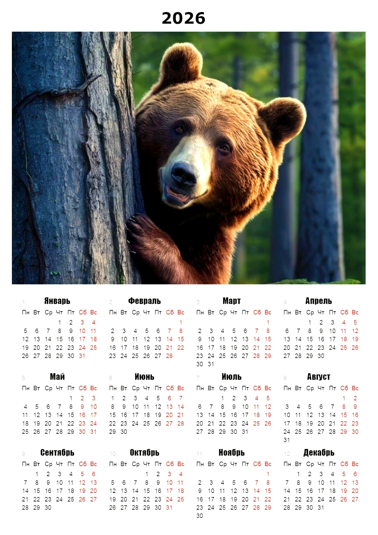 Календарь на 2026 год, настенный,настольный карманный, иллюстрирован изображением бурового медведя-хозяина сибирской тайги,который выглядывает из-за сосны