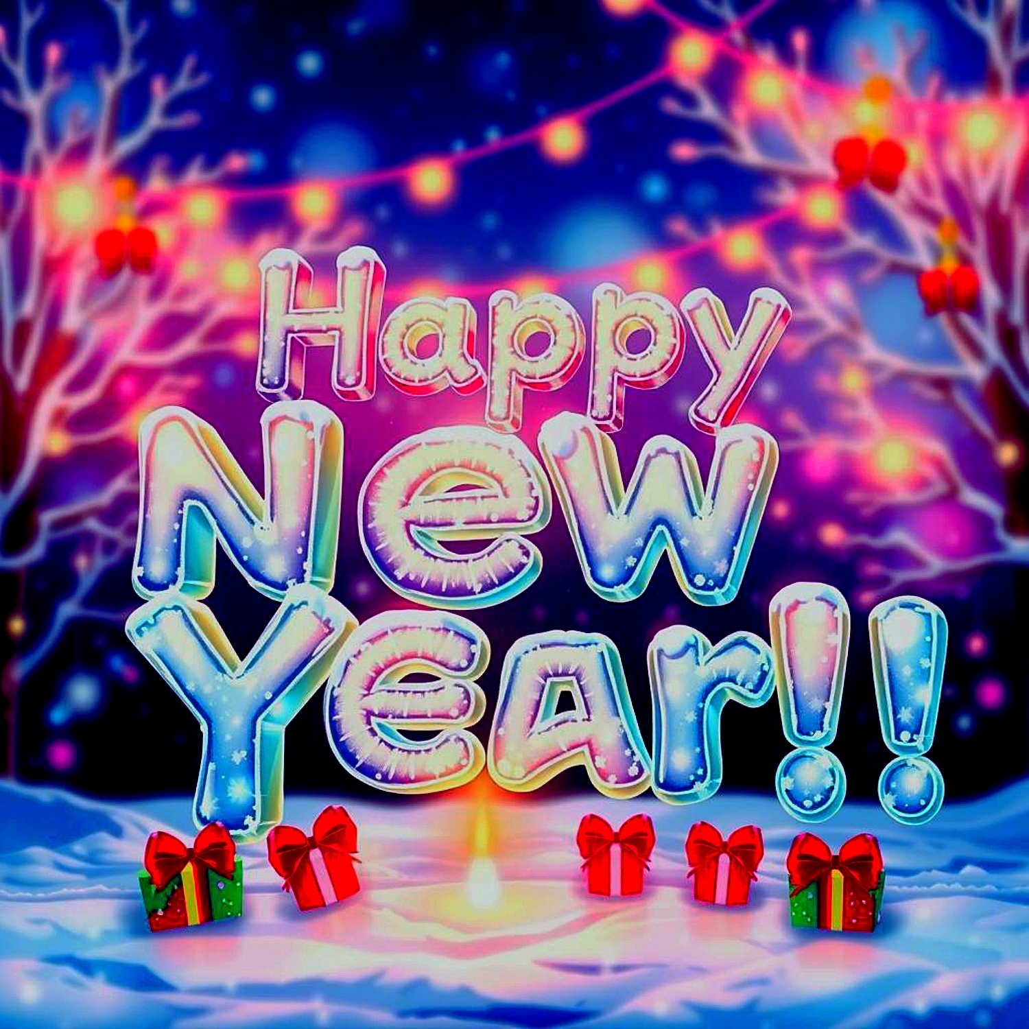 Новогоднее поздравление из ледяных прозрачных букв над снежной равниной с нарядными упаковками подарков, на фоне неба, украшенного праздничными фейерверками