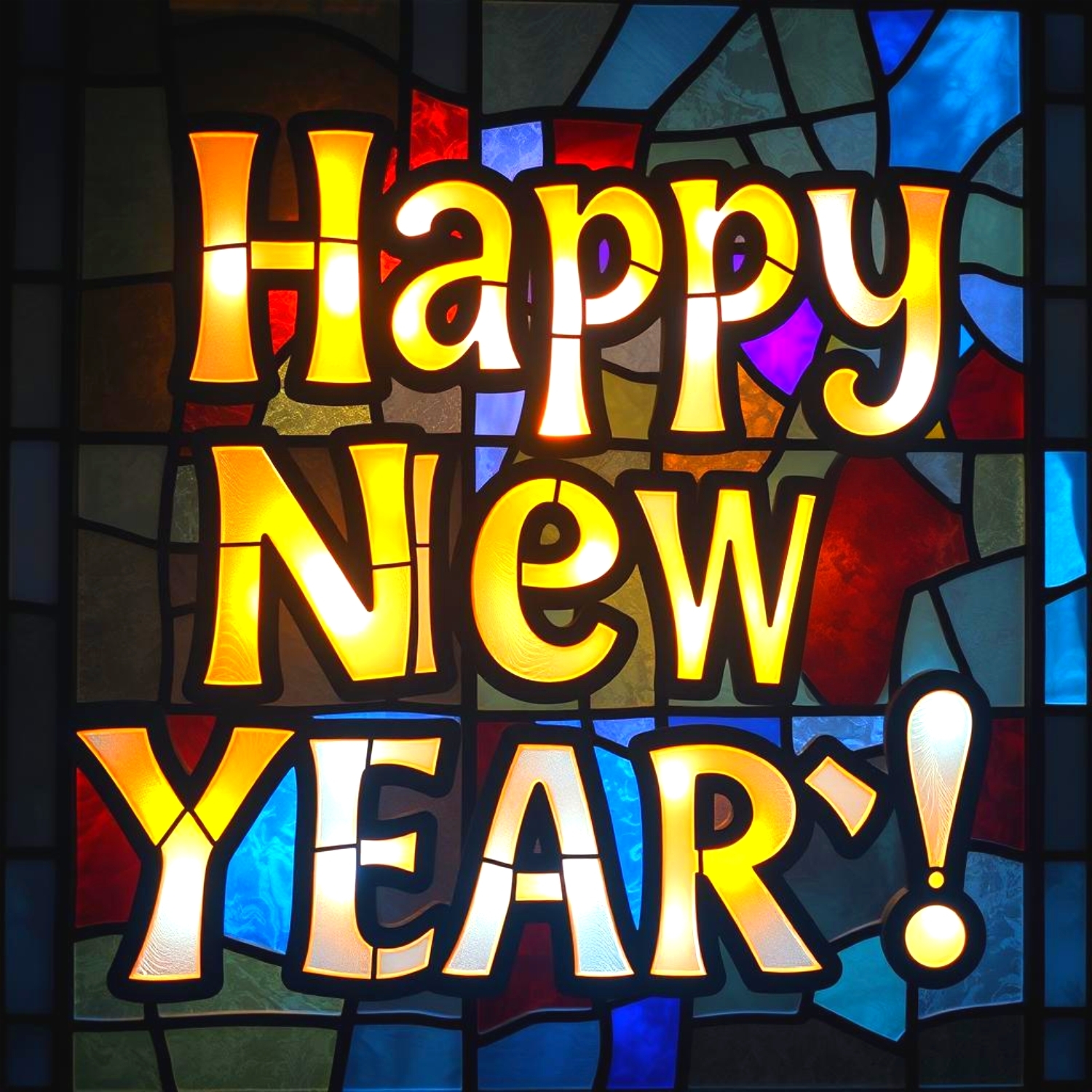Новогоднее поздравление"Happy New Year!" на фоне разноцветного витража из стеклянных составляющих.Может играть роль самостоятельной открытки или частью плаката