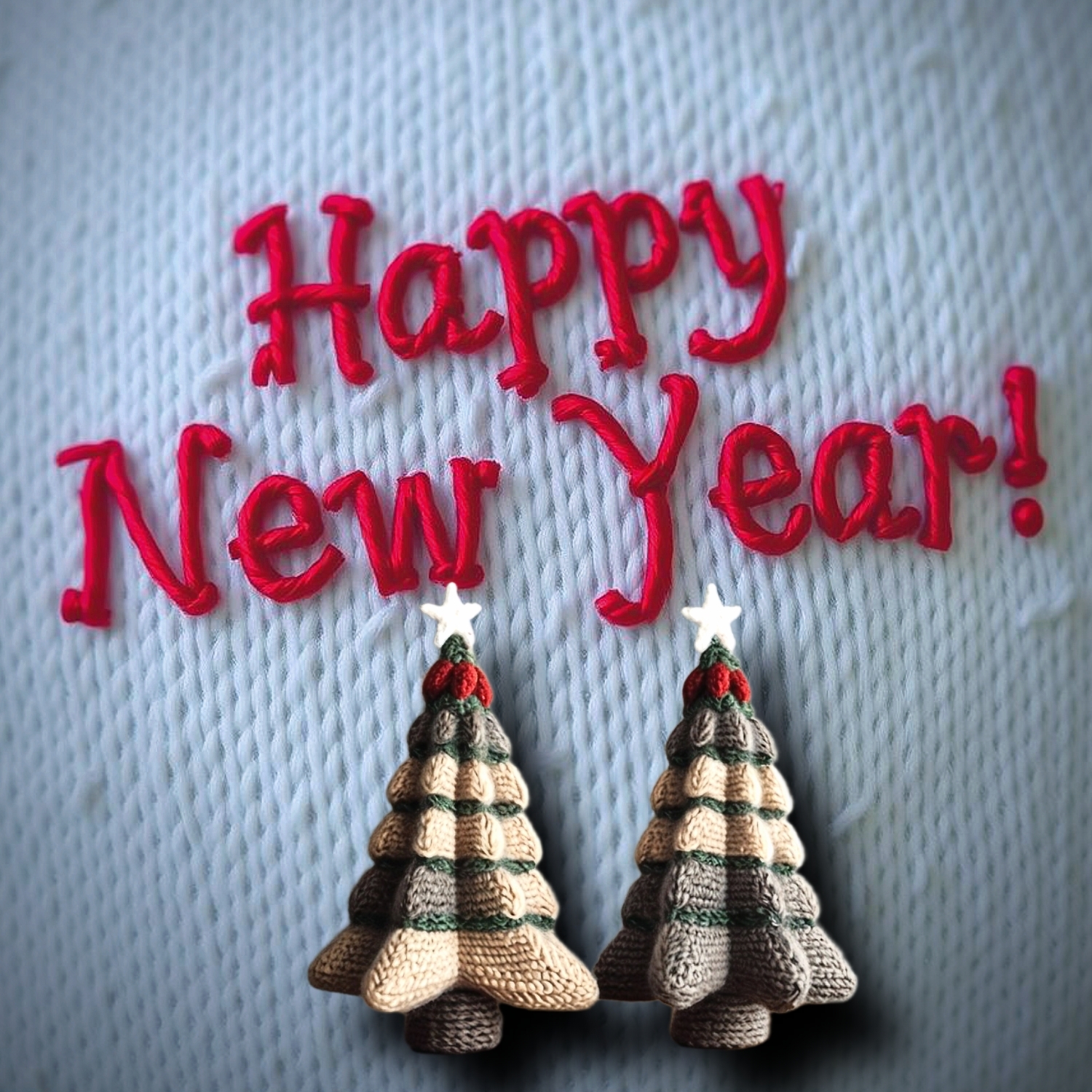 Новогодняя открытка с вышитыми буквами"Happy New Year!" , на фоне вязаного полотна и вязаной из шерстяных ниток разноцветной рукодельной елочкой