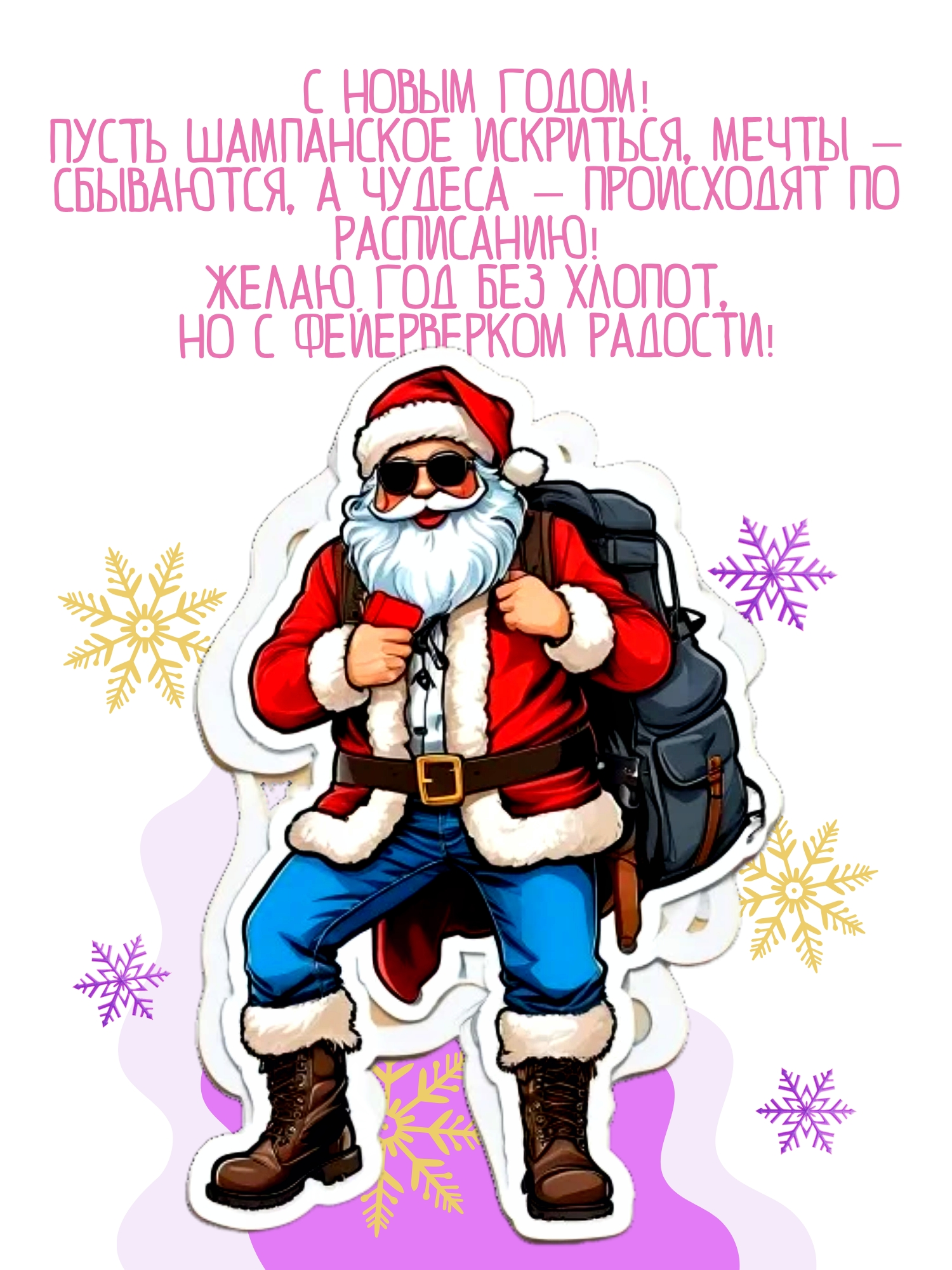 Поздравление с изображением брутального Деда Мороза в темных очках и джинсах,с рюкзаком подарков. Он идет сквозь снег и ветер, в своем красном кафтане и красном колпаке.