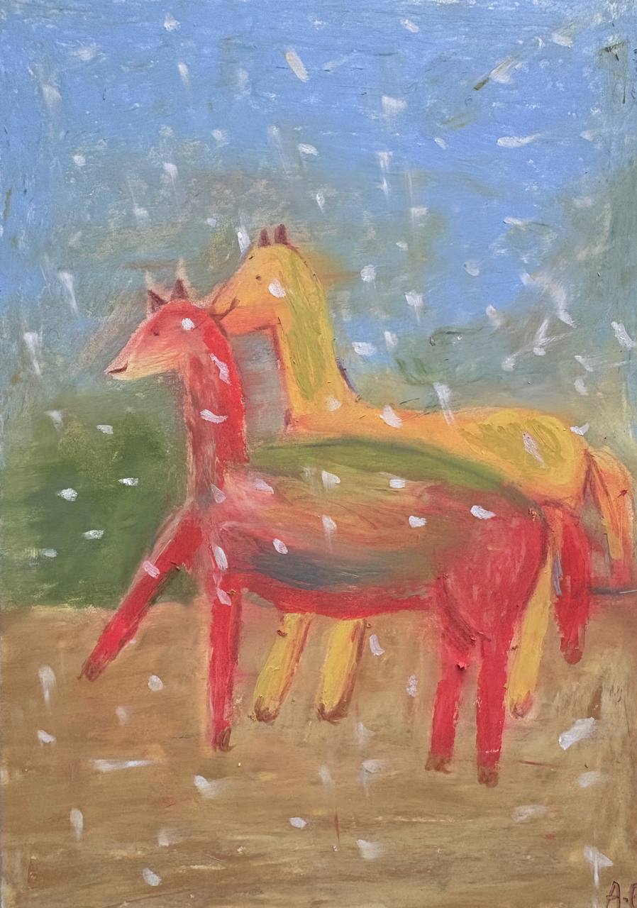 "Лошадки в лесу", масляная пастель, плотная бумага, А5. Лошади - символ удачи, любви и свободы. Мои лошадки принесут удачу! Небольшой формат смотрится мило и не занимает много места в интерьере.