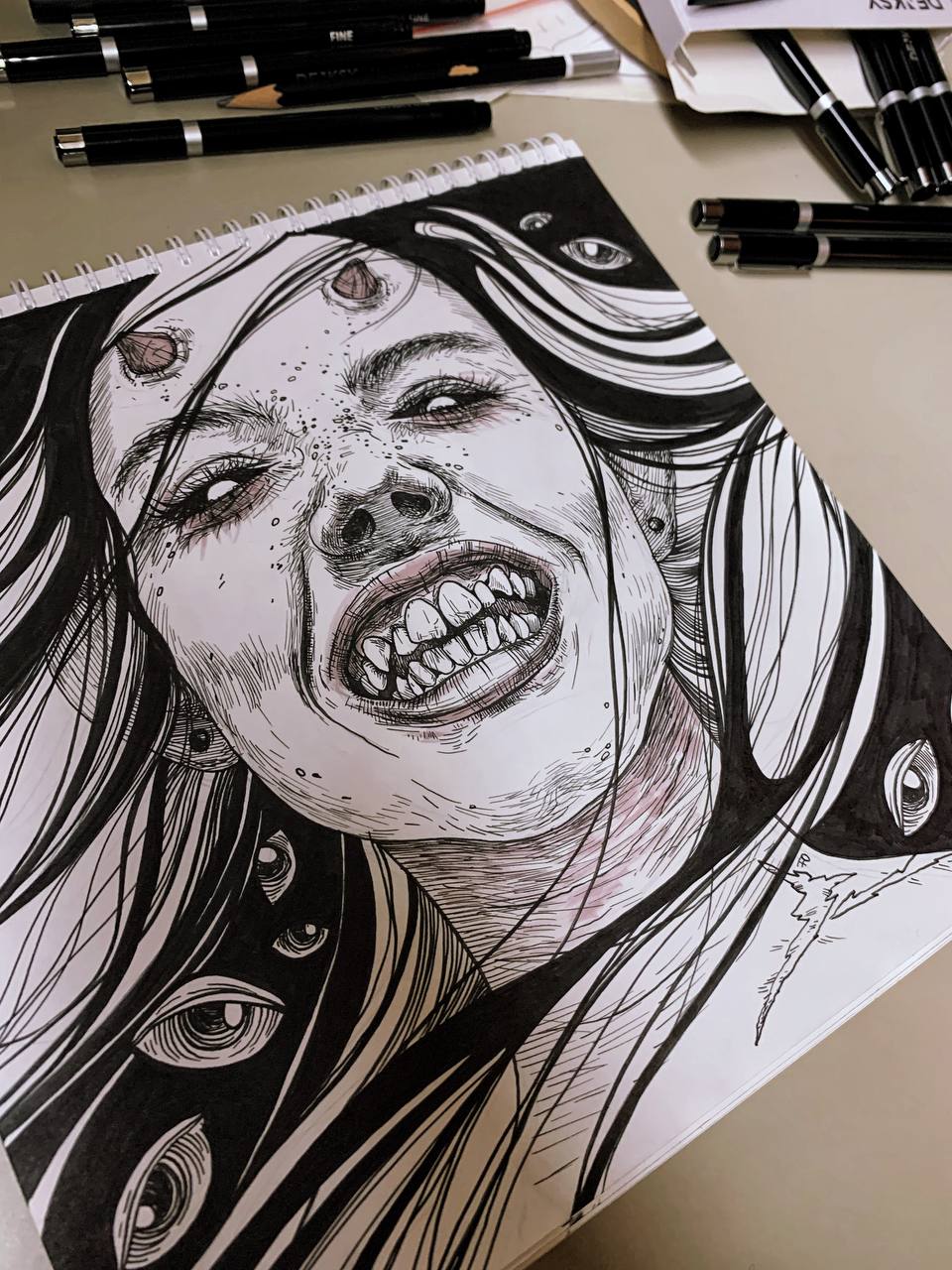 Работа выполнена линерами и маркерами для скетчинга.