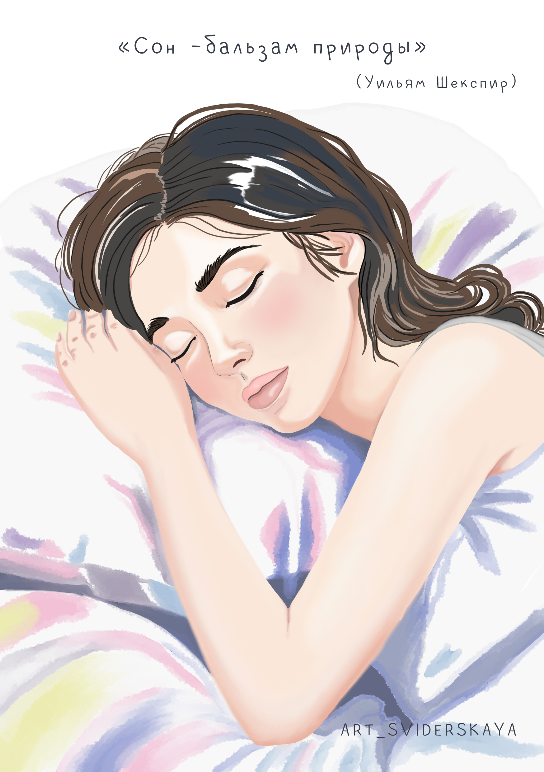 Открытка с цитатой "Сон - бальзам природы" (Уильям Шекспир) Открытка выполнена в растровой графике. Красивая девушка спит на мягкой подушке.