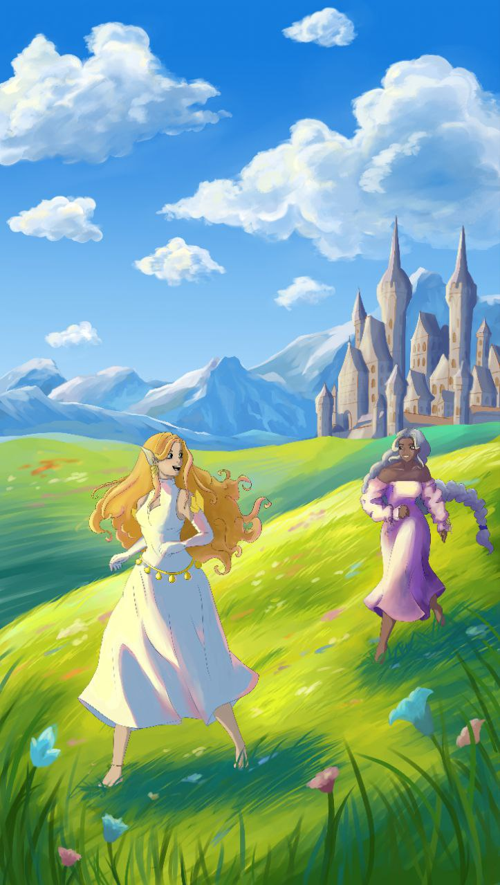 Арт фэнтэзи с двумя девушками. Блондинка в белом платье и седовласая в розовом. На фоне замок.