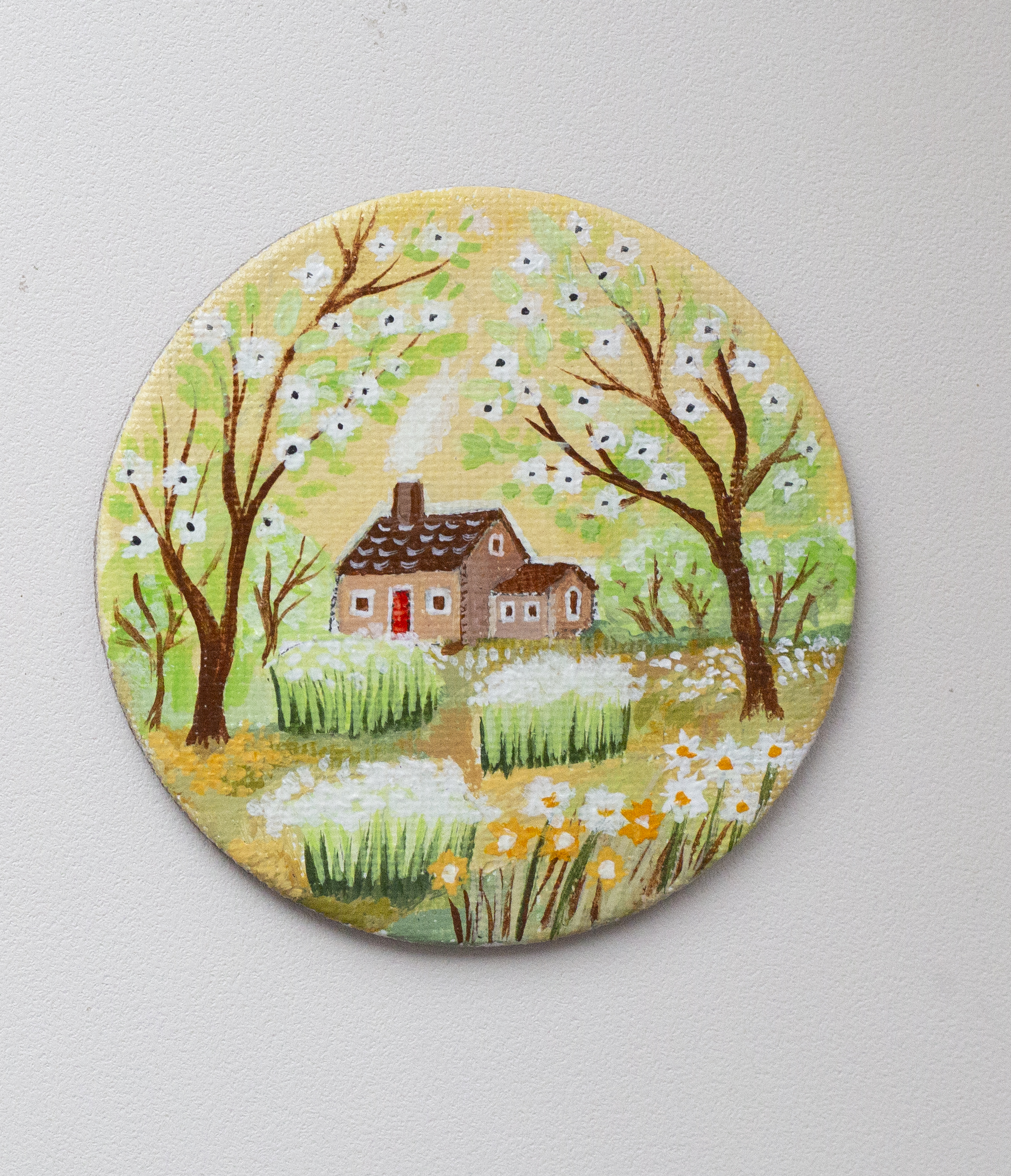 Миниатюра выполнена акрилом на холсте. Размер 7,5 см. весенний садик с распускающимися цветами слив, на грядках нарциссы Магнитик на холодильник