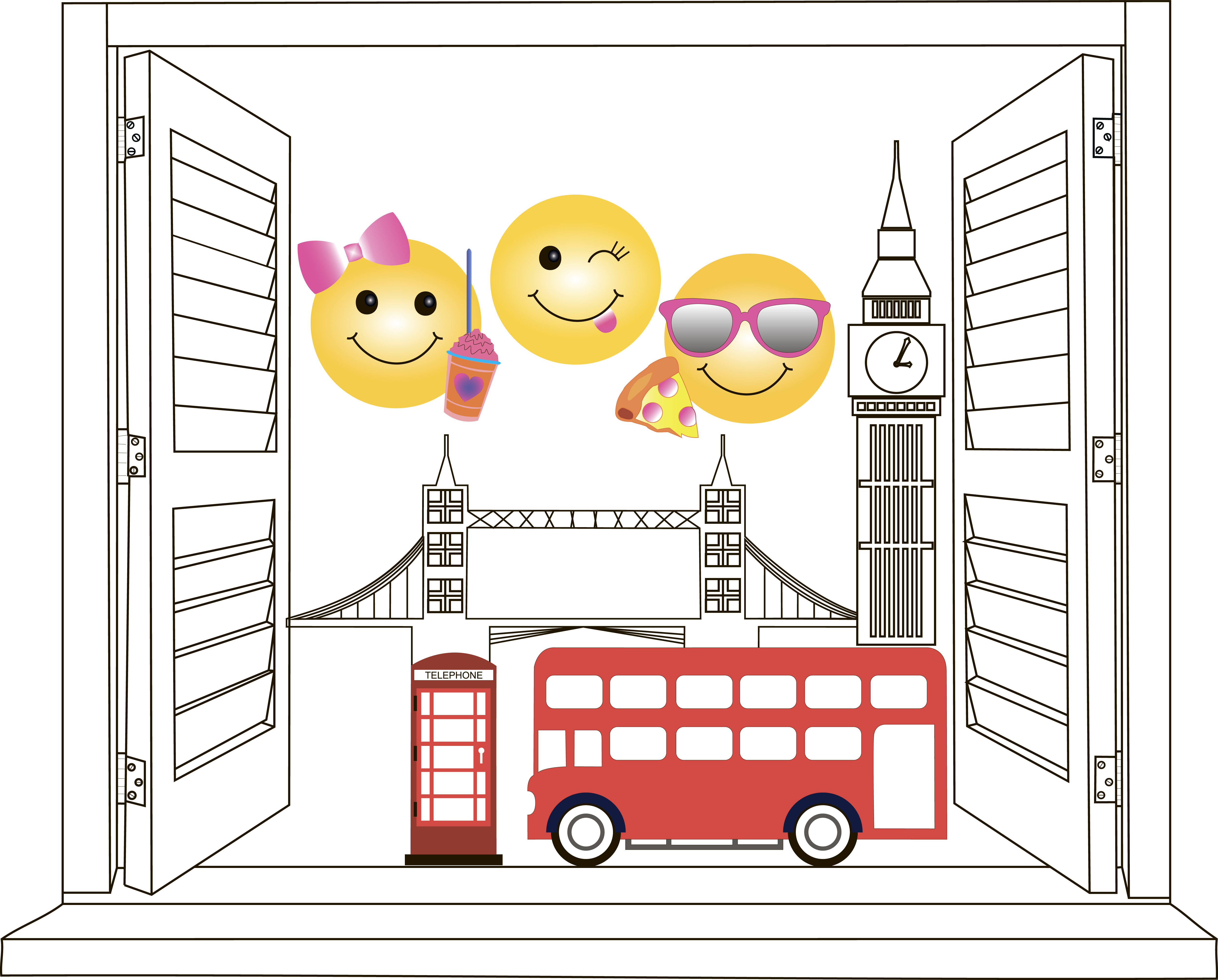 Векторная графика ( образец представлен в растровой). Открытое окно с видом на Лондон и трёх смайликов - путишественников, гуляющих по городу.