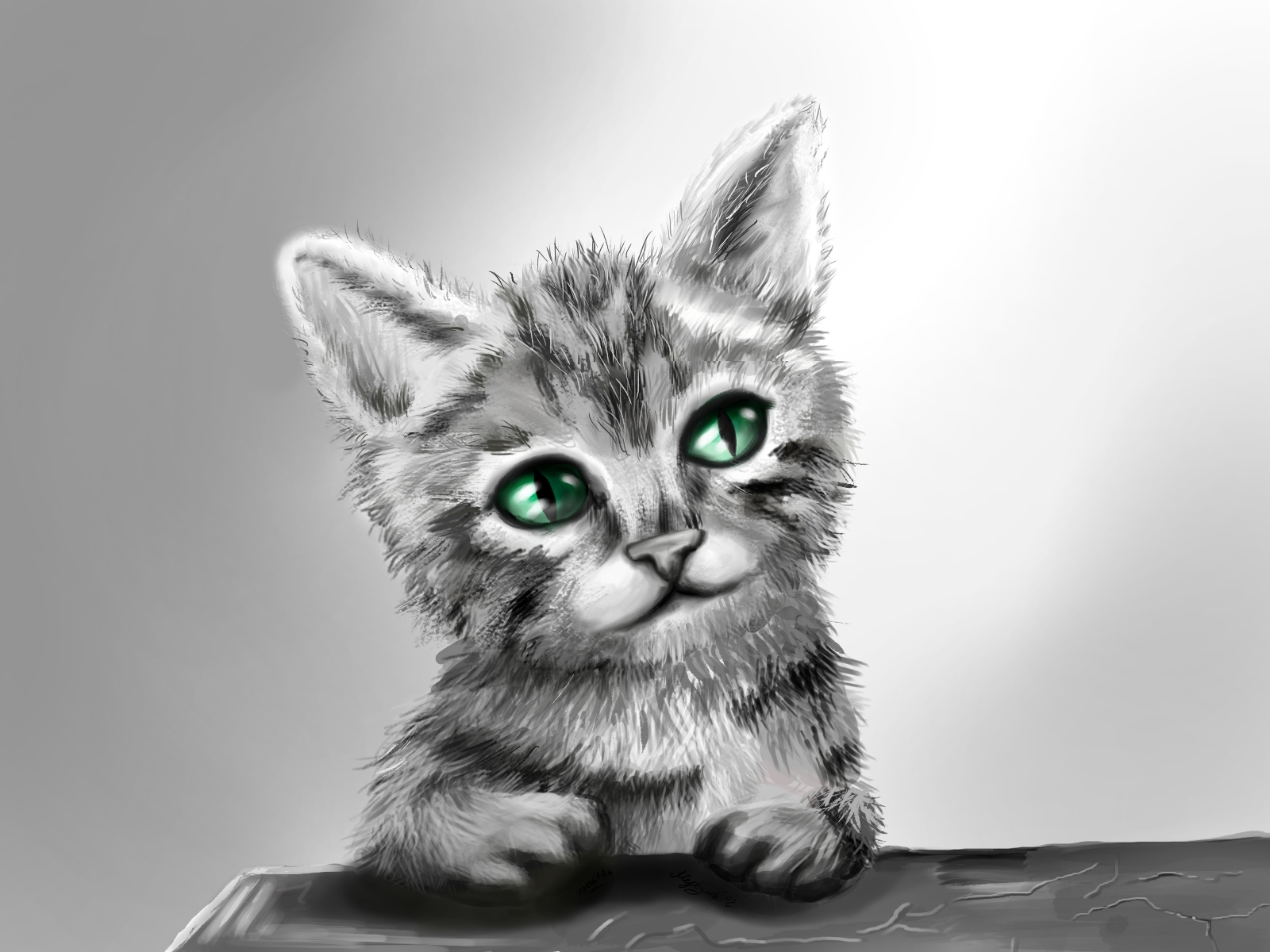 Котёнок серый с зелёными глазами, сидящий за столом на сером фоне. Выполнено в Krita. Пушистый и милый красавчик. Полосатый с чёрными и белыми полосками.