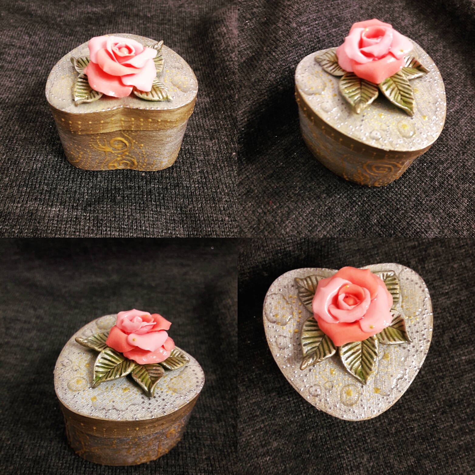 Сама коробочка из дерева покрытая акриловой позалотой и роза из полимерной глины,могу зделать подобное на любой цвет и вкус,и коробочку можно найти вам по вкусу