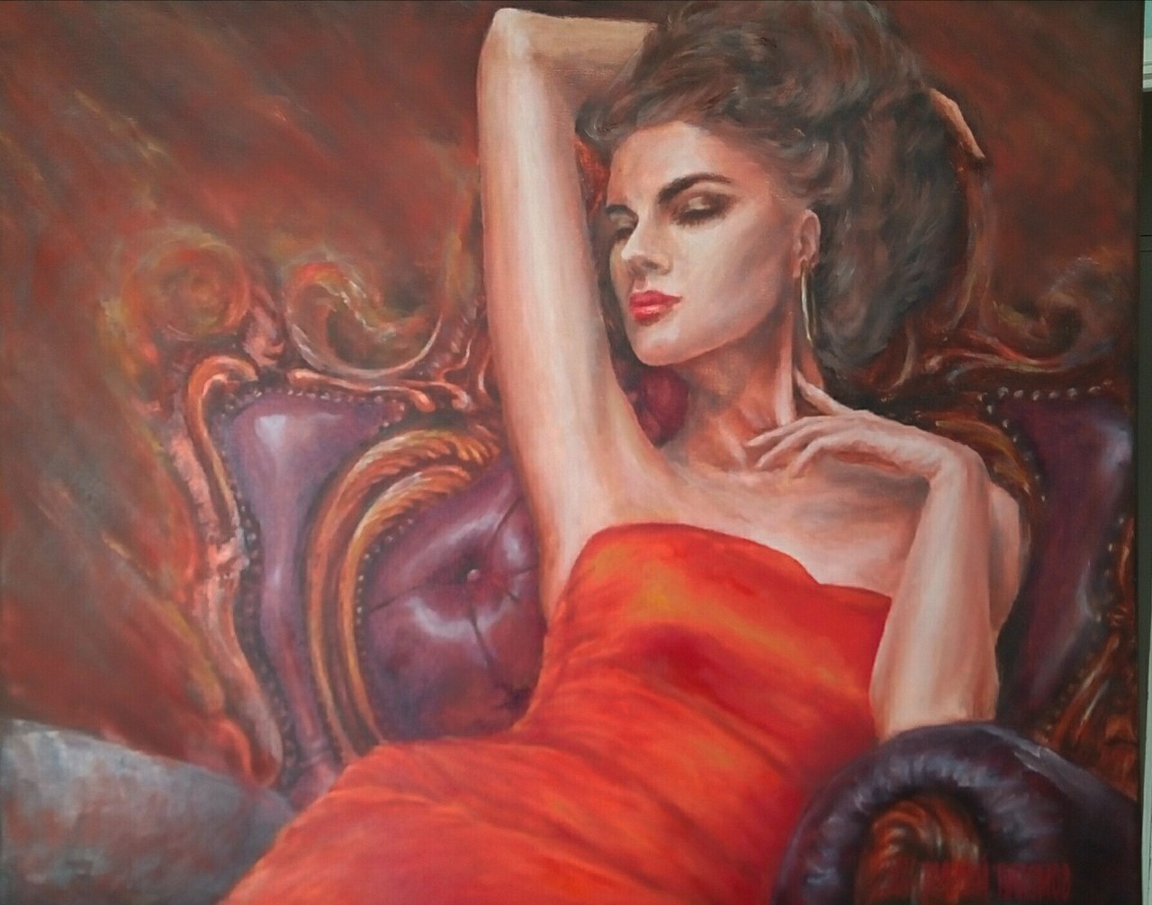 Холст. Масло. чувственная и эмоциональная картина. Можно прочитать эмоции как художника так и изображенной женщины на картине. Страсть, нежность.