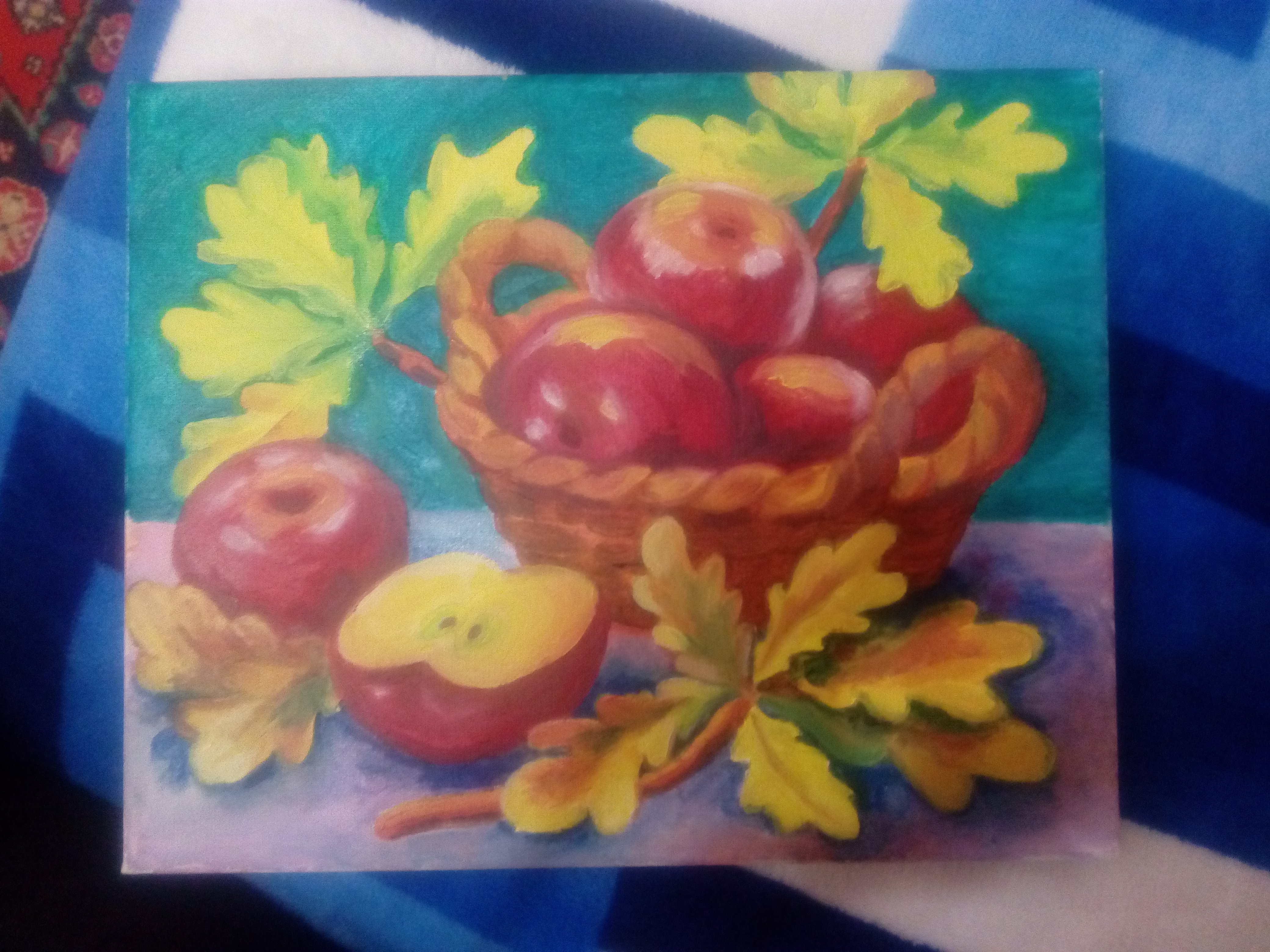Натюрморт, золотые листья дуба и красные яблочки ,хорошо подходит для украшения столовой или гостиной, супер подарок, запах осени отличный рисунок 29х23
