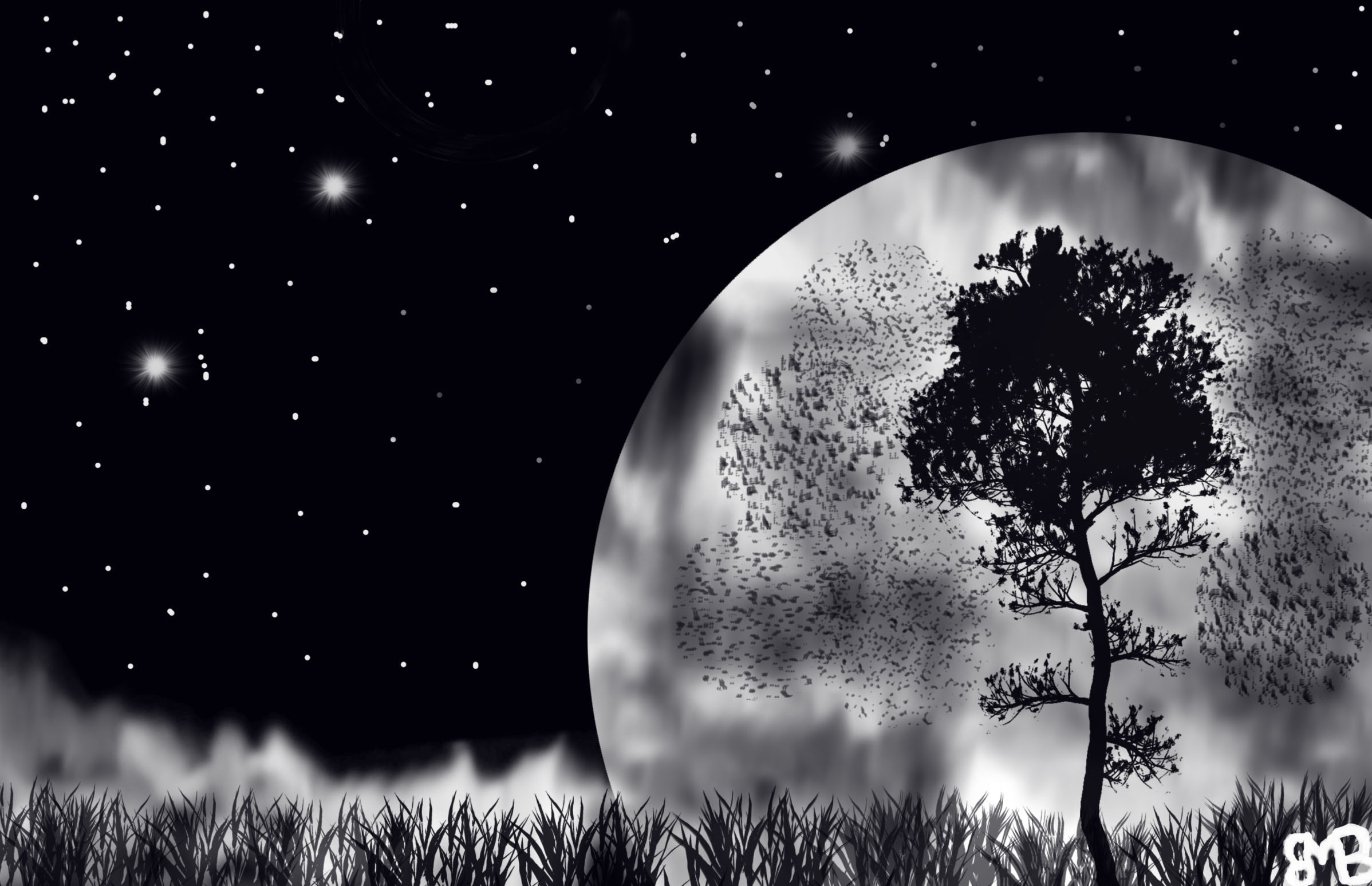 Одинокое дерево на фоне луны и ночное небо создают романтику,а также размышление о смысле бытия.Звездное небо и луна подчеркивают не обьятность вселенной.