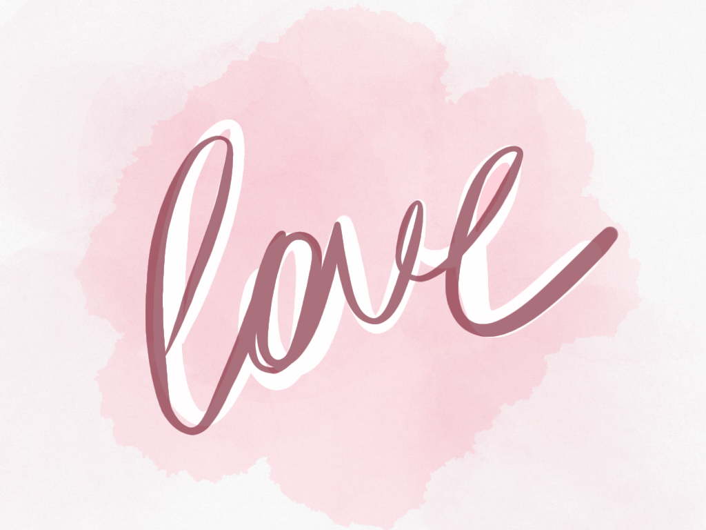 Слово "Love" с белой тенью на розовом акварельном фоне.