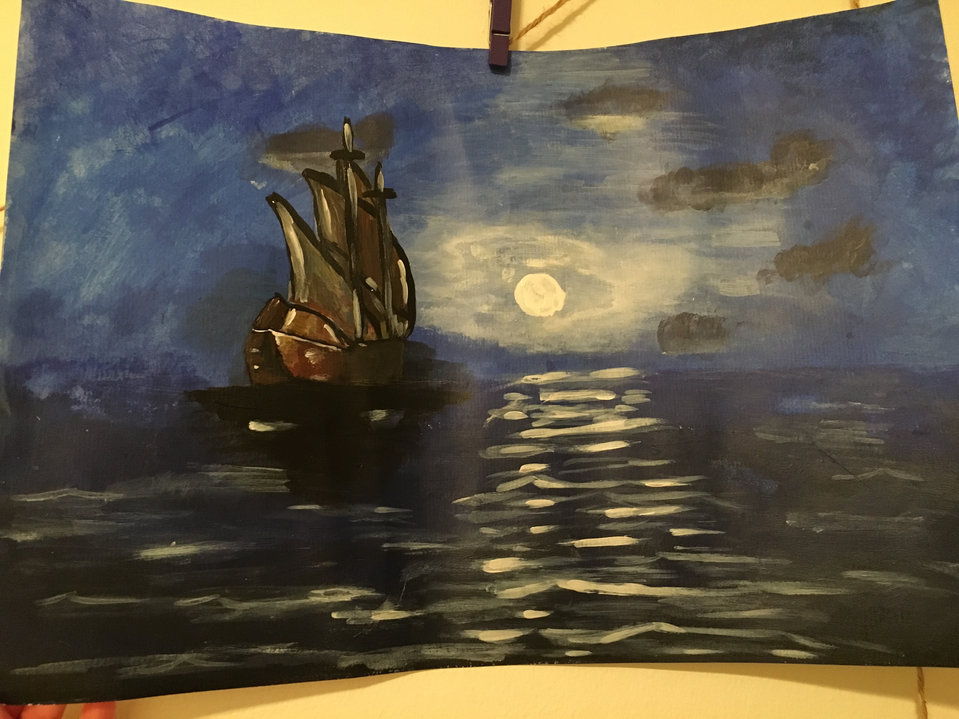 Темная ночь ,из под облаков виднеется луна и отражает лунный свет на океане и так же виднеется плывущий корабль ,путь которого освещает луна