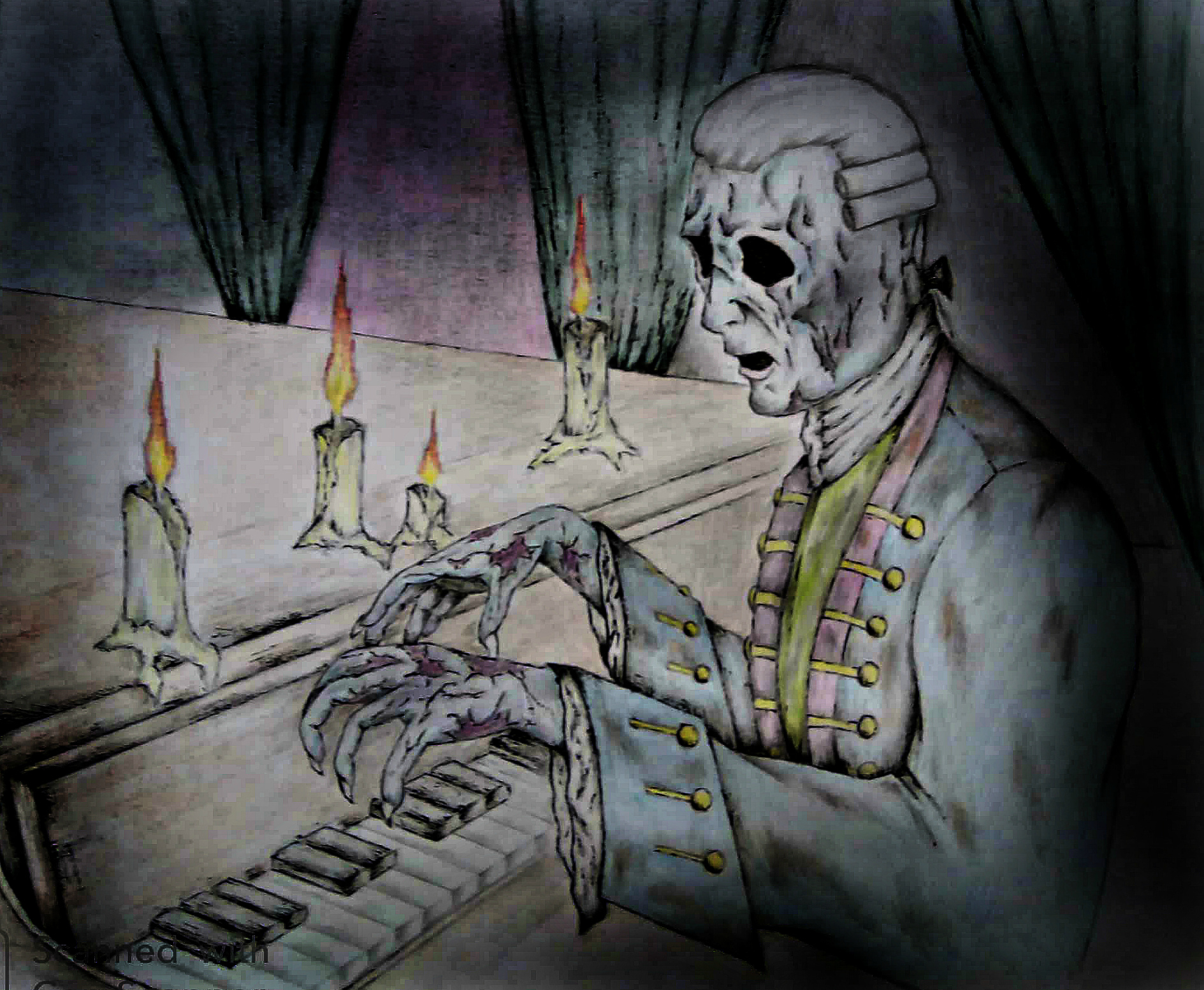 Рисунок выполнен простым карандашом и цветными карандашами и дополнен гелевой ручкой черного цвета. После немного обработан на компьютере при помощи редактора