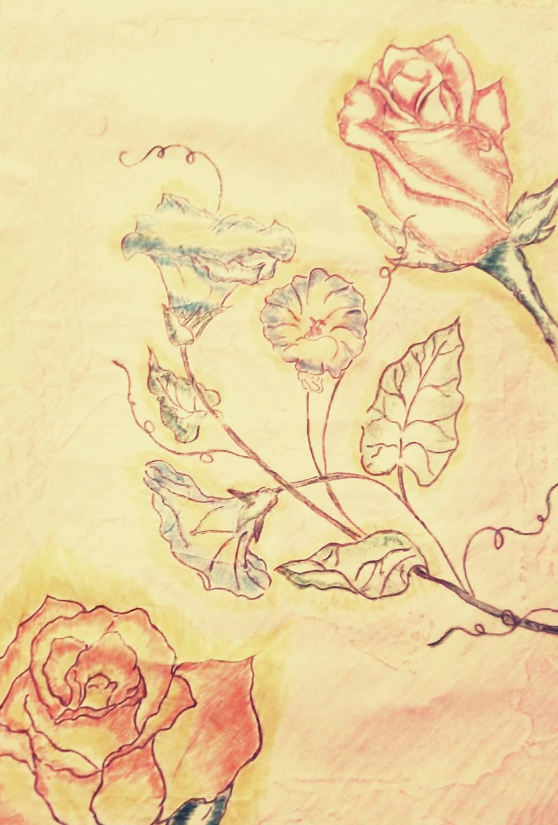 Розы и Лилии цветут в твоем саду,рисунок сделан карандашами проф и цветными проф,этот рисунок подарит хорошее настроение тому кто его преобретет!