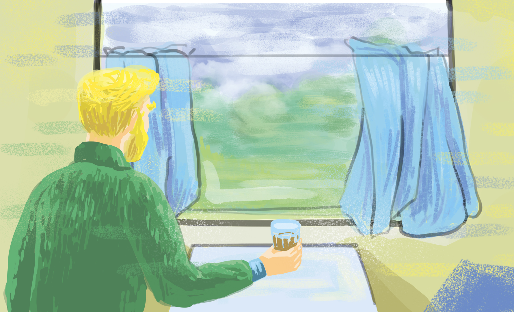 Иллюстрация связанная с уютом поездки в поезде. Картинка греет душу своим колоритом, а также свитером и чаем :) Но чувствуется и усталость, и желание вернуться домой