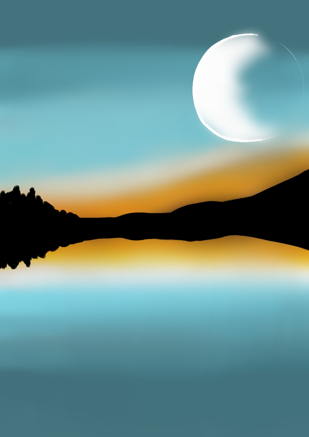 Замечательный летний пейзаж озера, окружённого лесами. Прекрасно видеть такую огромную луну и уже почти закончившийся закат, который также отражается в небольшом озере.