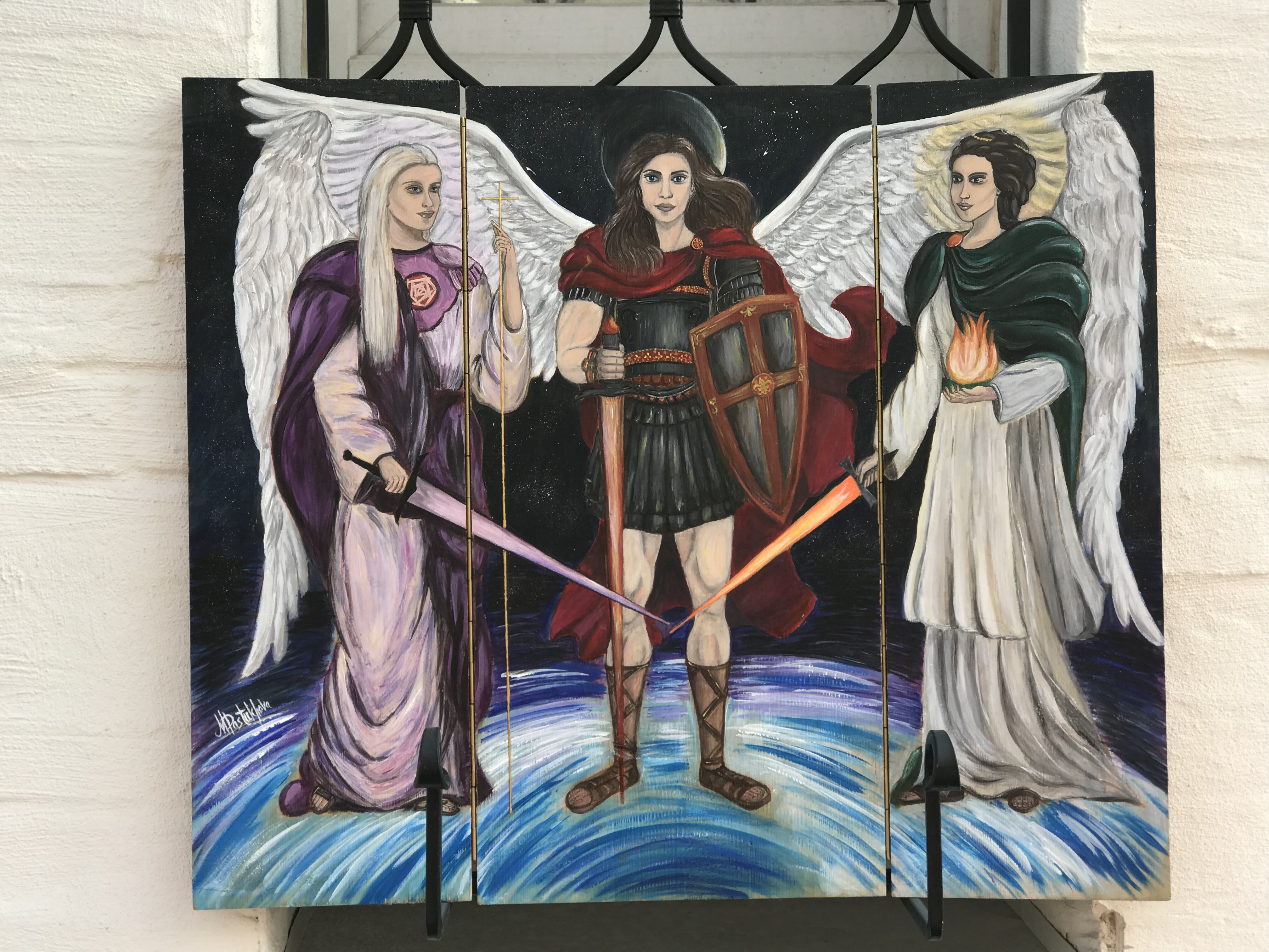 Триптих-картина акрилом на дереве. Образы трех великих Небесных защитников Архангел Самуил, Архангел Михаил, Архангел Уриил. На обороте описание.