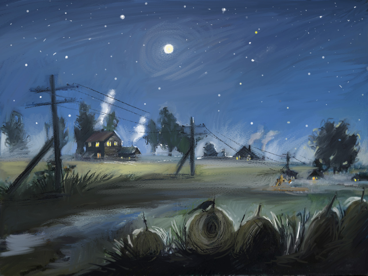 Работа выполнена акрилом на холсте, отредактирована в фотошоп. Ночь, туман и лето. На работе изображен последний месяц лета. когда присутсвуют дожди и влажность.