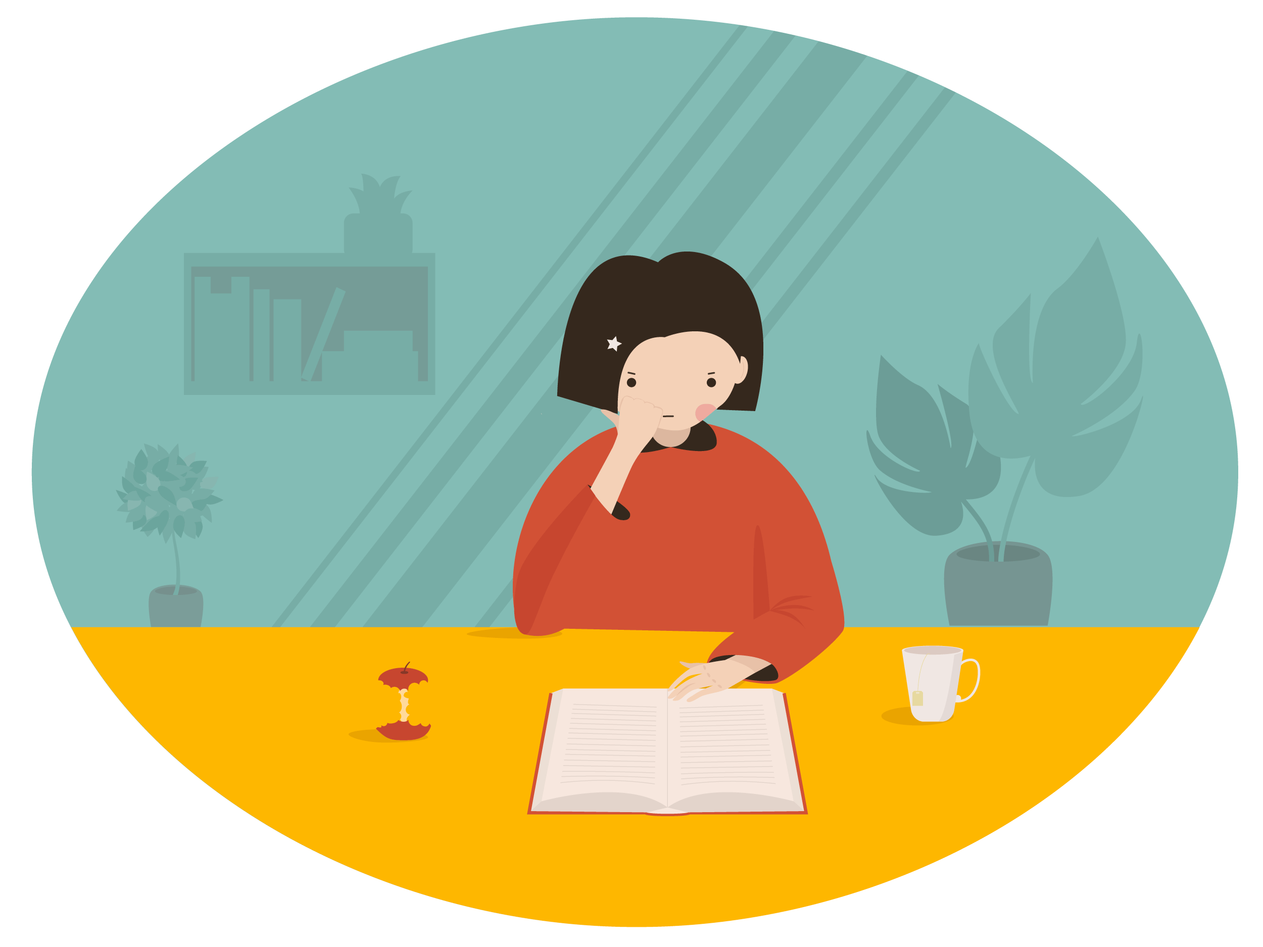 На иллюстрации девушка напряженно и сосредоточенно читает достаточно большую книгу, на столе лежит съеденное яблоко, а также выпитый чай. На фоне цветы и книжная полка.