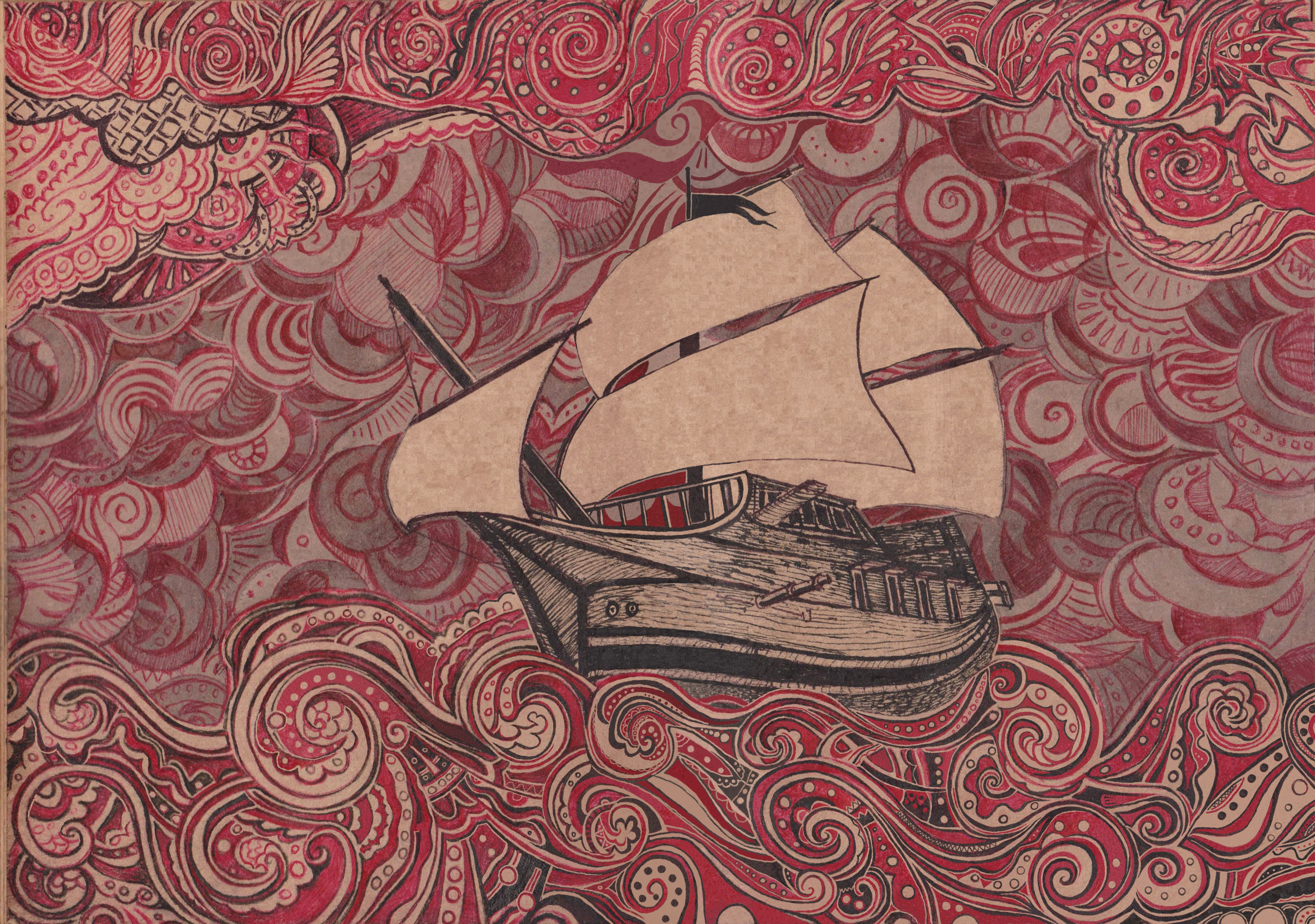 Бумага- крафт. Выполнено акварелью, тушью и шариковыми ручками: красной и чёрной. Работа выполнялась трое суток с небольшими перерывами на сон. Изображены корабль и спонтанные узоры. Так же можно увидеть рыб, волны, морскую пену, щупальца, птиц, облака и т. д.( в зависимости от воображения зрителя).