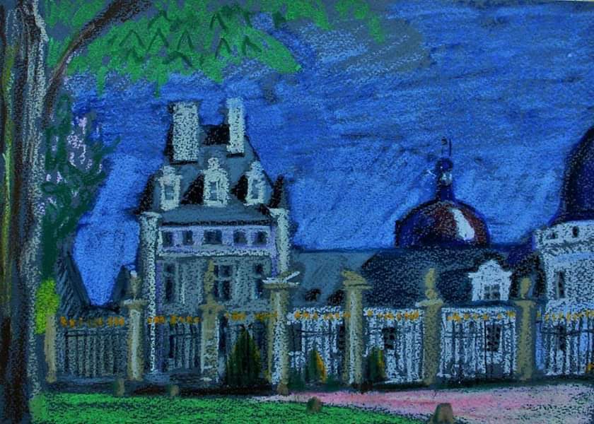 Замок Талейрана в городе Валансе во Франции(Центральный регион, долина реки Луары). Цветная бумага,масляная пастель. 24x32. Пленэр 2018 года,. Публикую фоагиент графического листа.