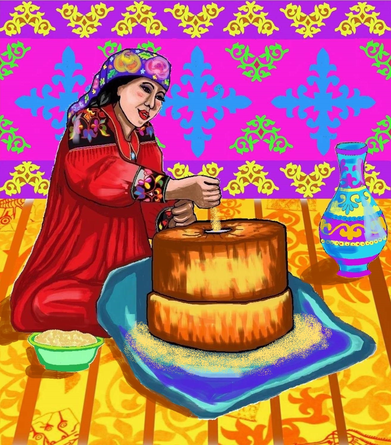 Рисунок для пазлов. Действие происходит в хакасской юрте, женщина в традиционном костюме на ручной мельнице готовит хакасское блюдо -талган