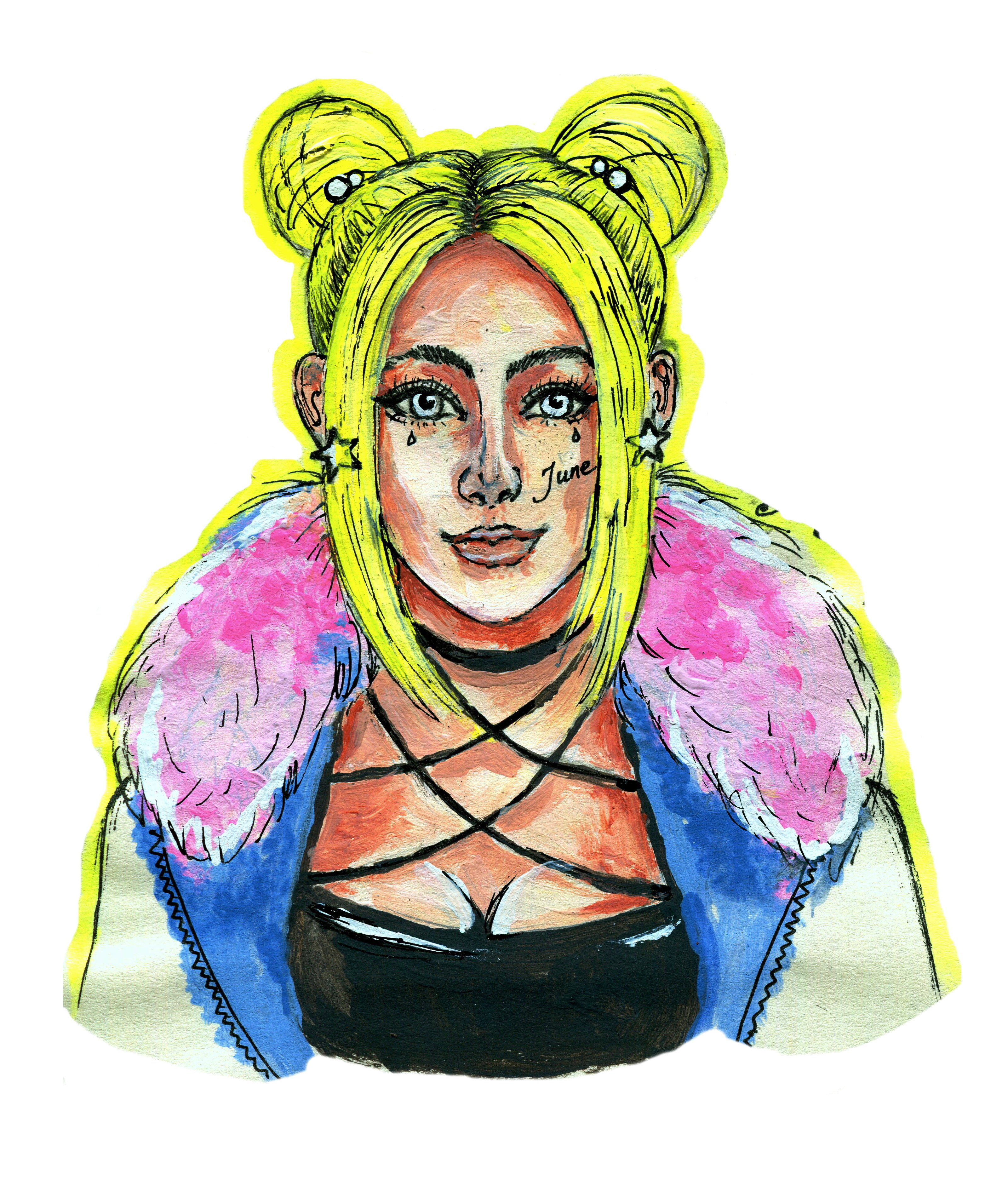 Это образ из моей головы, так в какой-то период времени хотела выглядеть я сама. Теперь девочка обрела имя, и ее зовут June - Июнь. Рисовалась она остатками акрила от картины по номерам :)