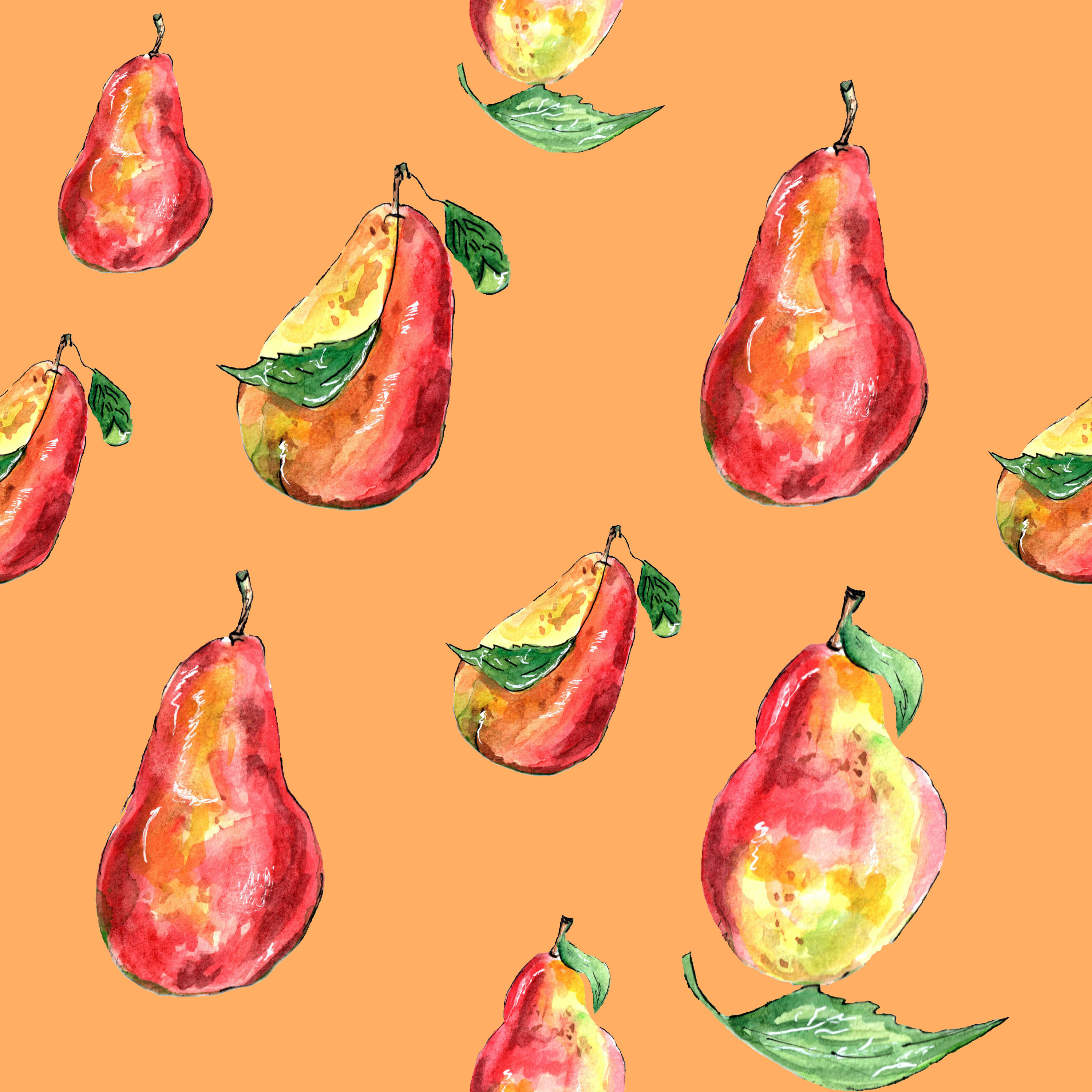 Паттерн с сочными, яркими грушами на оранжевом фоне, выполненный в акварельной технике, черным линером и белой гелиевой ручкой. Паттерн бесшовный.