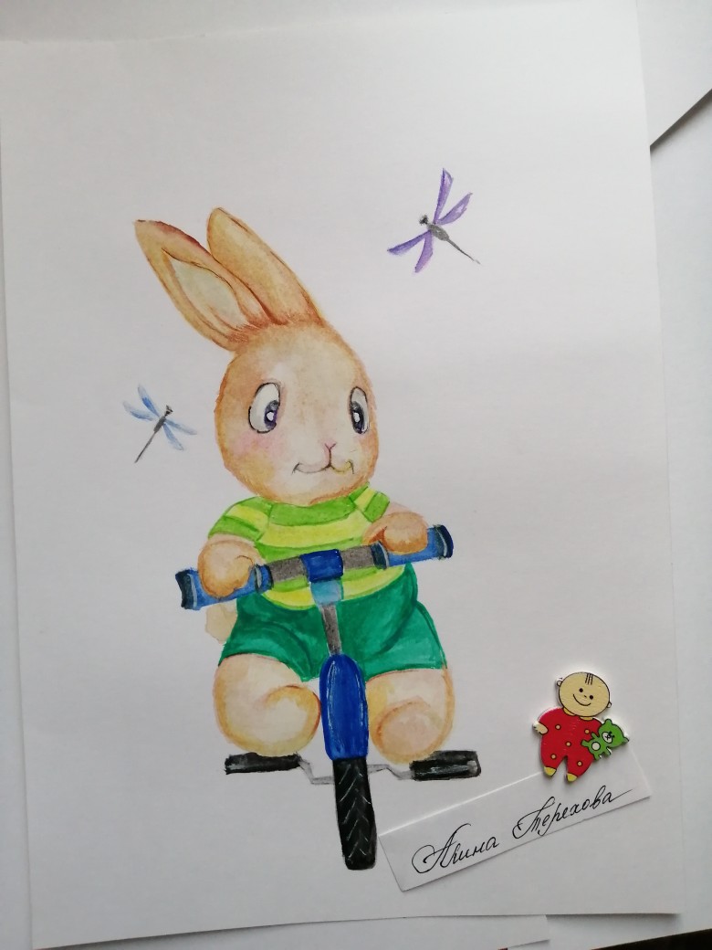 "Зайчик на велосипеде" может стать замечательной иллюстрацией для принта детской одежды и постельного белья и, чудесным дополнением в детскую