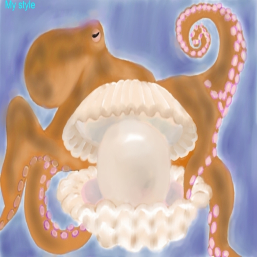 Арт. Довольный осьминог держит ракушку с красивой жемчужиной на фоне глубокой синевы. Авторская работа, "от руки", не компьютерная обработка.