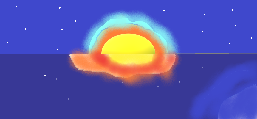 Закат. Изображение является предметом декора. Картина выполнена из тёмных красок, что увеличивает ценность изображения. На вид похож на рисунок восьмилетнего, но нет - это абстракционизм.