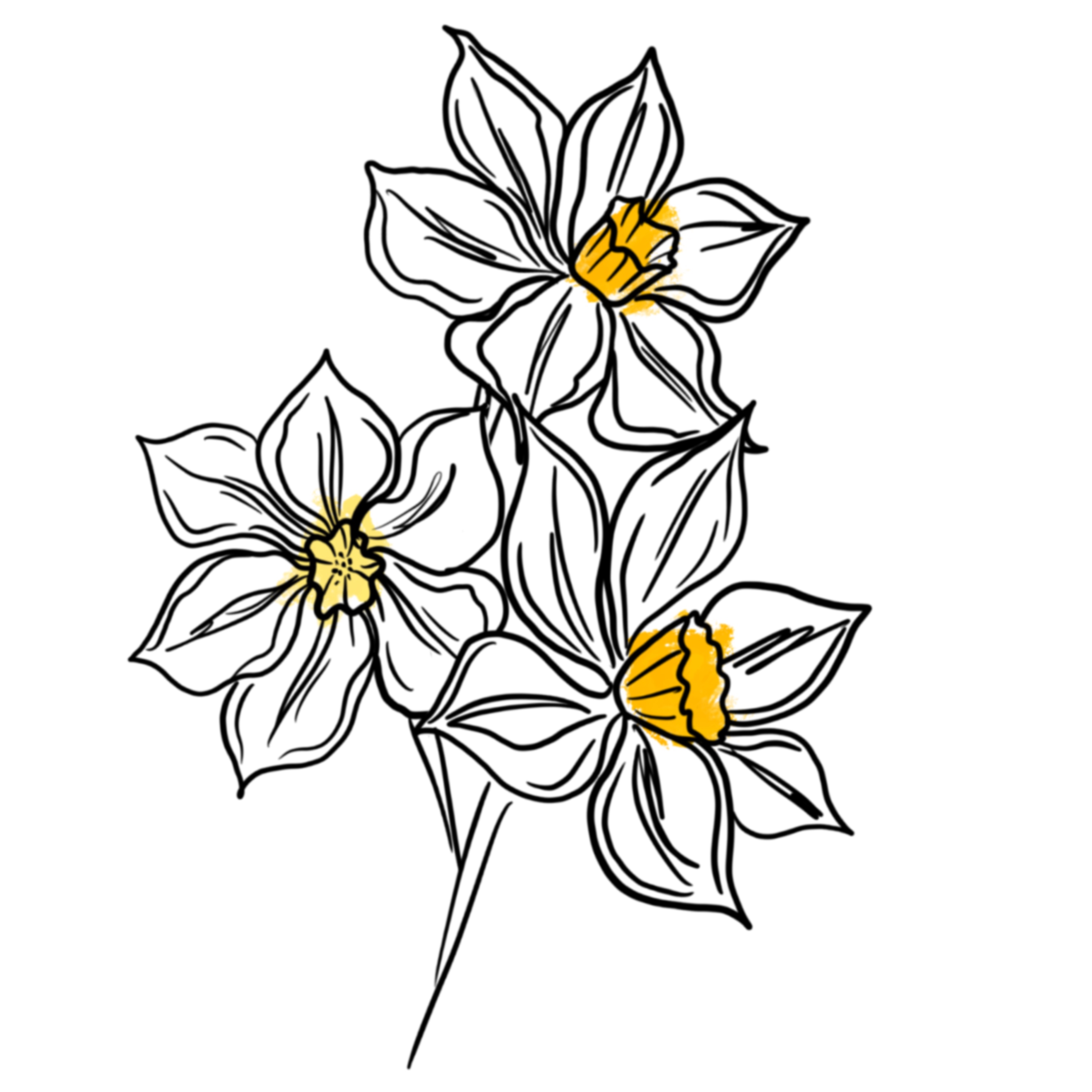 Графичный скетч композиции из нарциссов будет хорошо смотреться на сумке или в качестве принята на брошь. Яркие сердцевинки солнечного цвета отлично поднимают настроение и напоминают о весне.
