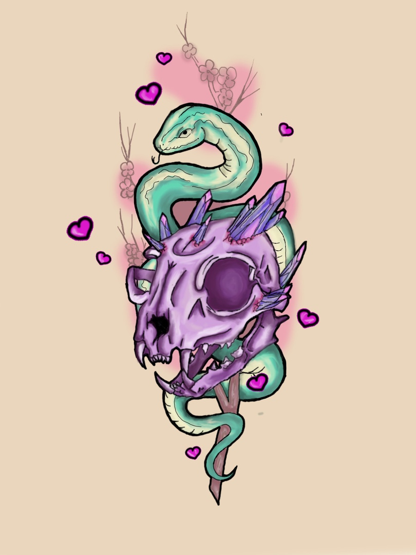 Эскиз татуировки\возможный принт для одежды выполненный в приятных оттенках. Череп кота, кристаллы, дружелюбная змея. Надеюсь данный эскиз найдет своего владельца