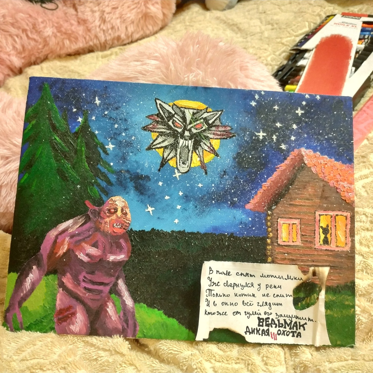 Картина выполнена мослом на холсте из игры Ведьмак 3 дикая охота ,холст небольшого размера. Помимо масло,в картине присутствует черная тушь