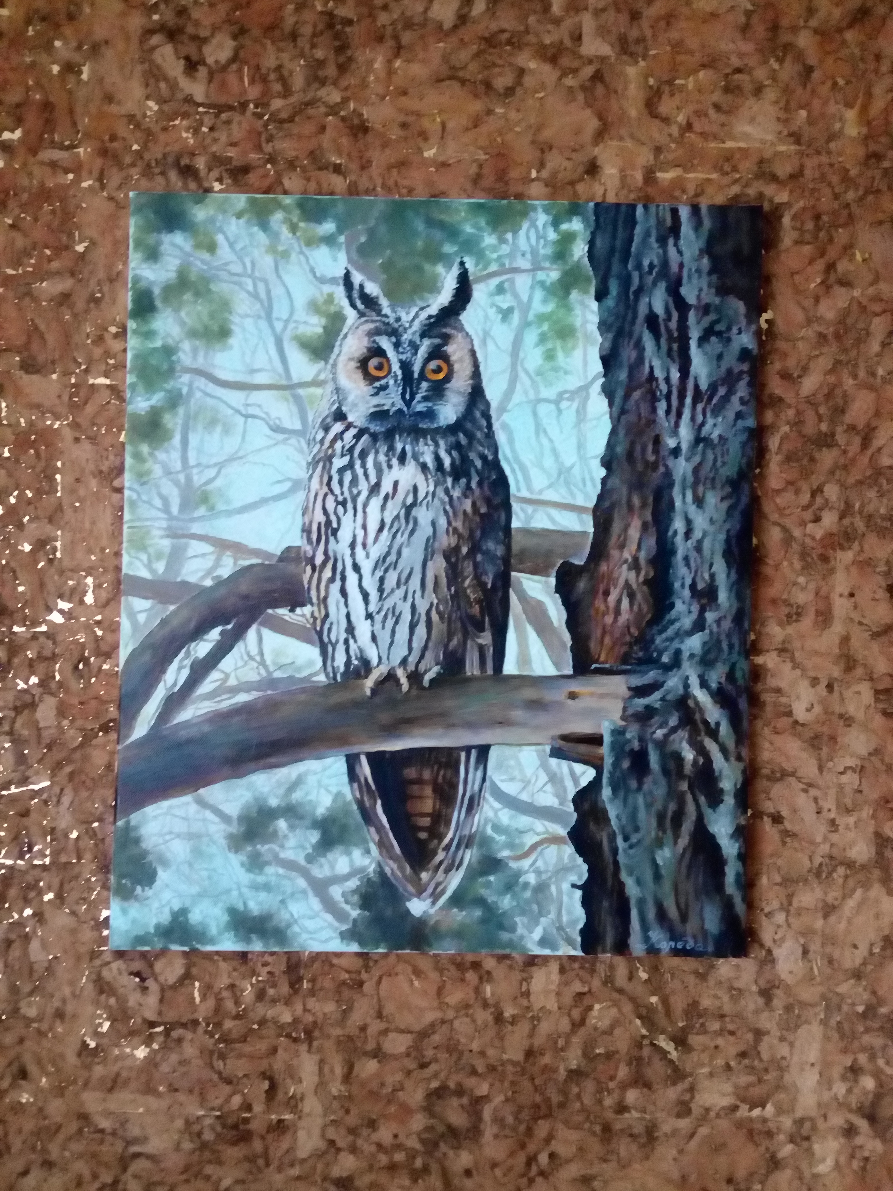 Живописная картина выполненная на холсте маслом.Сова сидящая на ветке в лесу.Очень гармоничная с выраженным характером. Украсит любой интерьер. Раму подбирают под интерьер по этому продается работа без багета.